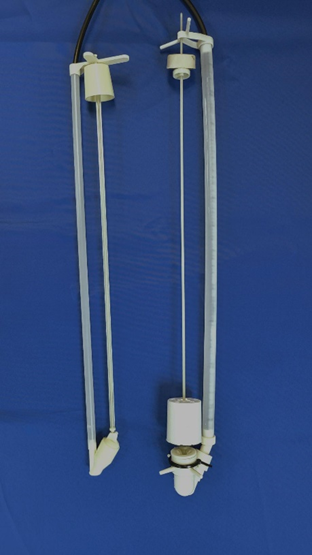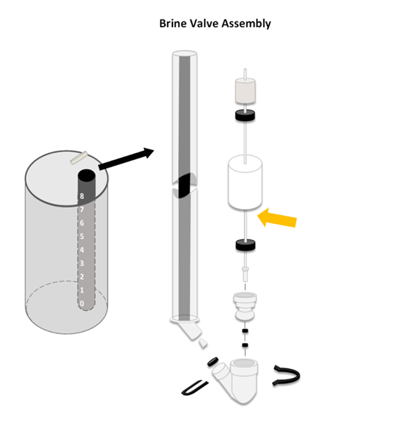Note: We have 2 versions of brine valve assemblies (pictured below.) If you have the one on the left, it has a plastic float and it can’t be taken apart and cleaned. If you have that one and still have this issue, please Contact Us for help to troubleshoot. If you have the one on the right with the Styrofoam float, follow the instructions below to clean the seal.
