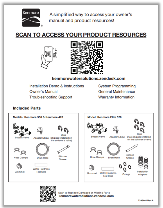 Kenmore Product Insert (QR Code) February 25, 2026 21:32 Updated Click document to view: Kenmore_Product Resource Insert BW_7396444_RevA.pdf 400 KB Download Related articles Interpreting My Water Softener's Model and Serial Number Can't find your product? What Material are the Bypass Valve and Valve Head Made of? Brine Valve Assembly Replacement How do you know when it's time to upgrade your softener?
