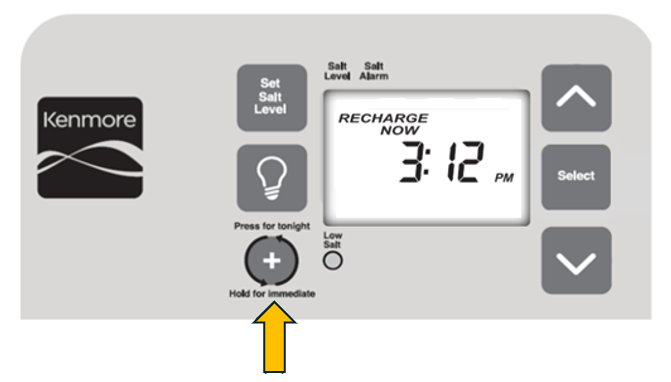 2. Now you'll depressurize your unit by running a Recharge cycle. Hold the Recharge button until you hear the motor start to spin, and then release. You'll see ‘Recharge Now’ or ‘Recharging’ flashing on the screen.
