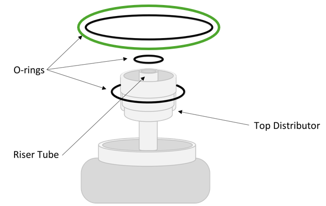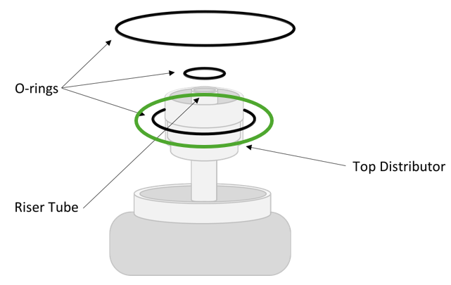 3. Place the medium sized O-ring (circled in green) on the bottom of the top distributor and fit the basket onto the riser tube.