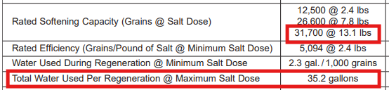Below is the maximum amount of salt and water this system could use in one recharge - 35.2 gallons of water @ 13.1lbs of salt use.